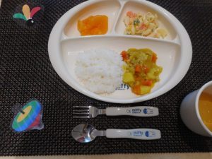 ・ごはん、カレーシチュー、マカロニサラダ、みかん缶