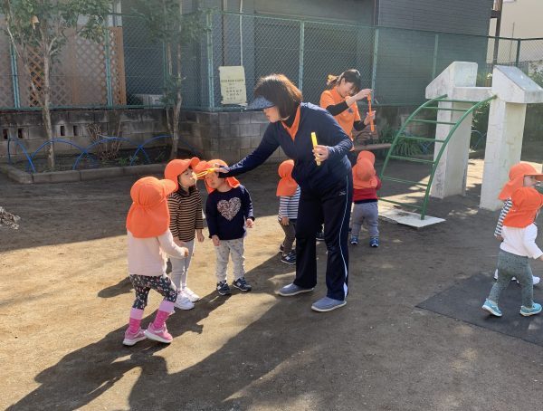 先生が持っているシャボン玉の棒に上手に息を吹きかけて遊ぶことができました![]()