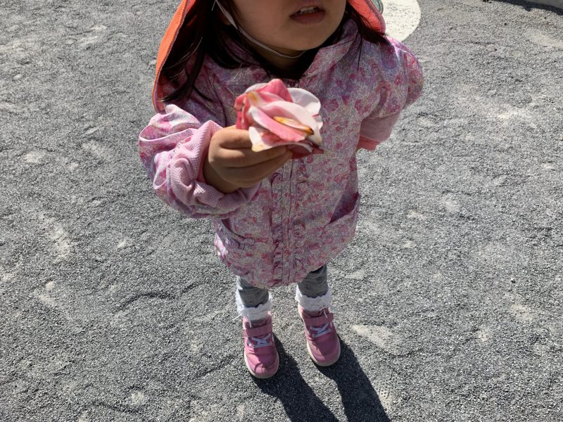 ピンク色のきれいなお花の花びらが落ちていたようで、それを拾っていたみたいです![]()