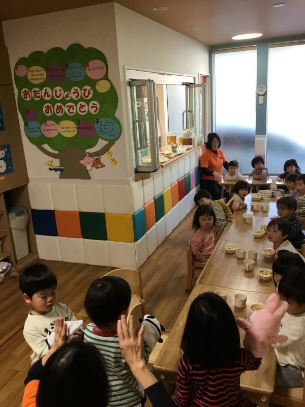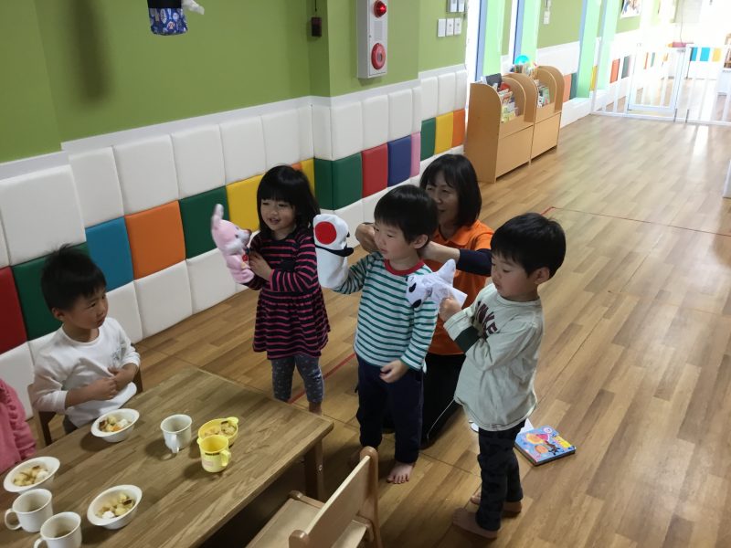 午後おやつの前の集まりの時間、保育士とみんなで主役を呼びます![]()