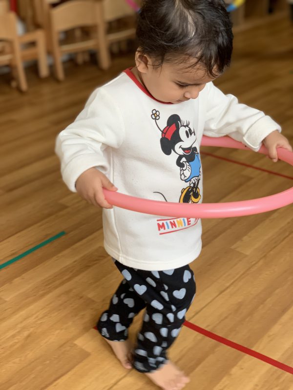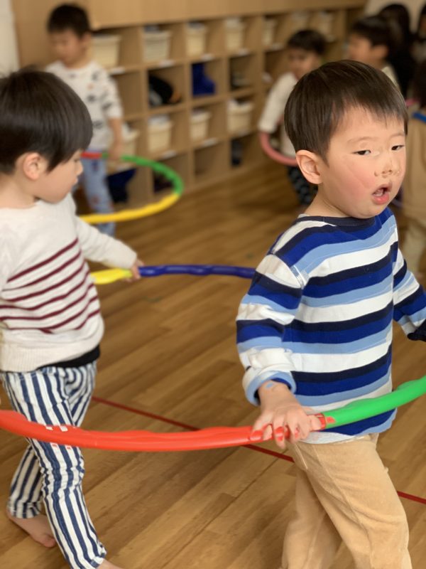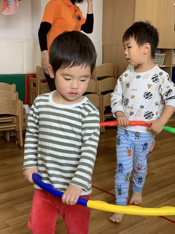 保育室でフラフープに入ってレッツ電車ごっこ![]()