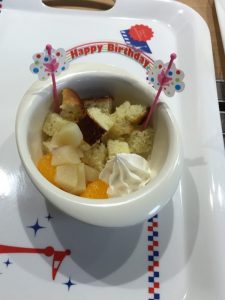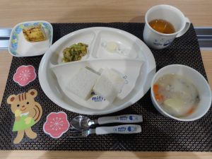 ・食パン、チキンクリームシチュー、混ぜ混ぜサラダ、チーズ、バナナ
