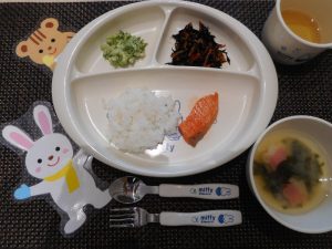 ・ごはん、みそ汁、鮭の塩焼き、ひじきの炒り煮、茹でブロッコリー