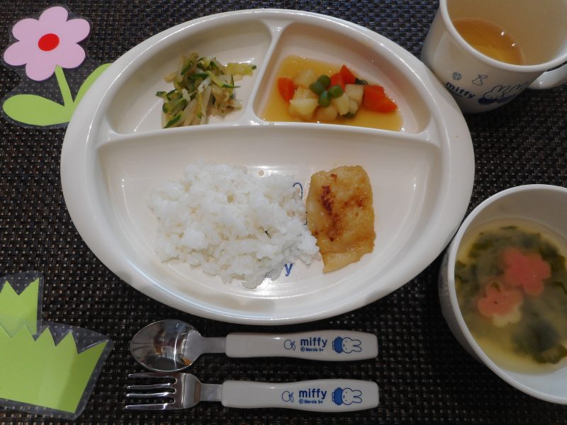 ご飯、味噌汁、魚の西京焼き、含め煮、おかか和え、