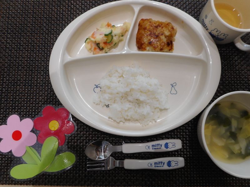 ご飯、味噌汁、豆腐のつくね焼き、ポテトサラダ