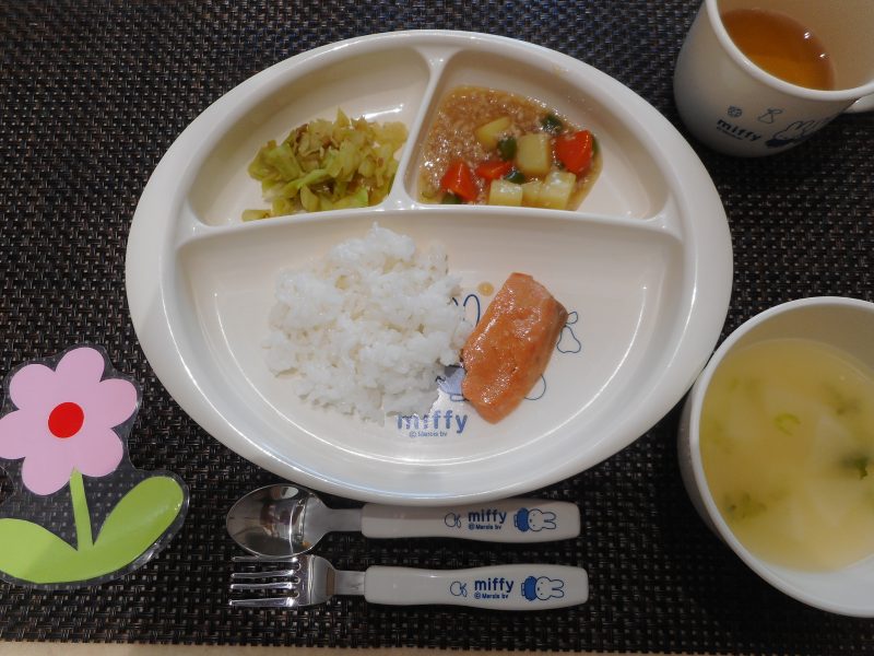 ご飯、味噌汁、鮭の照り焼き、そぼろ煮、おかか和え