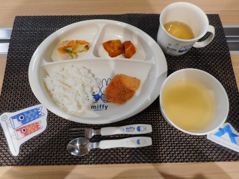 ご飯、味噌汁、鮭の香り味噌やき、野菜炒め、かぼちゃの甘辛煮