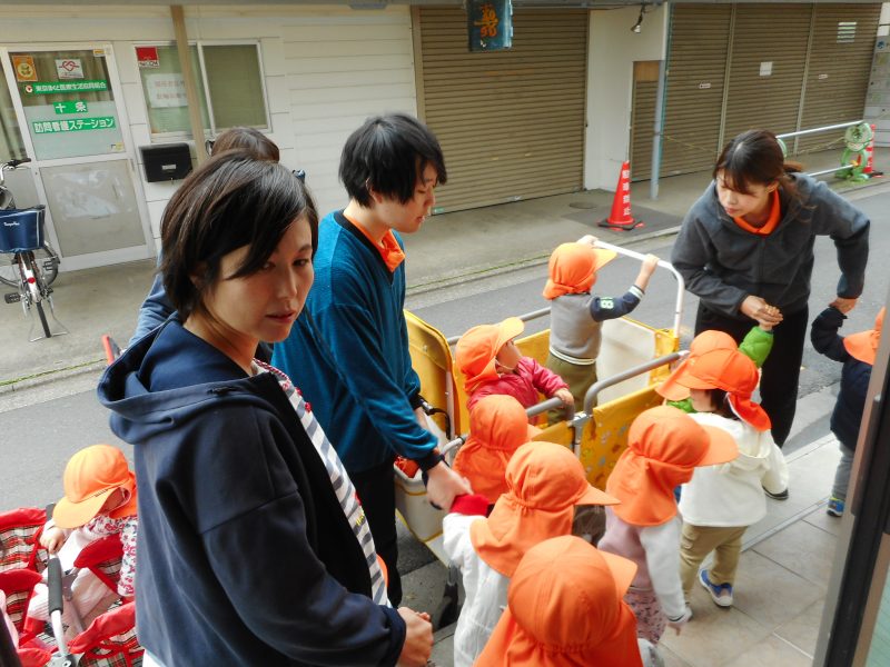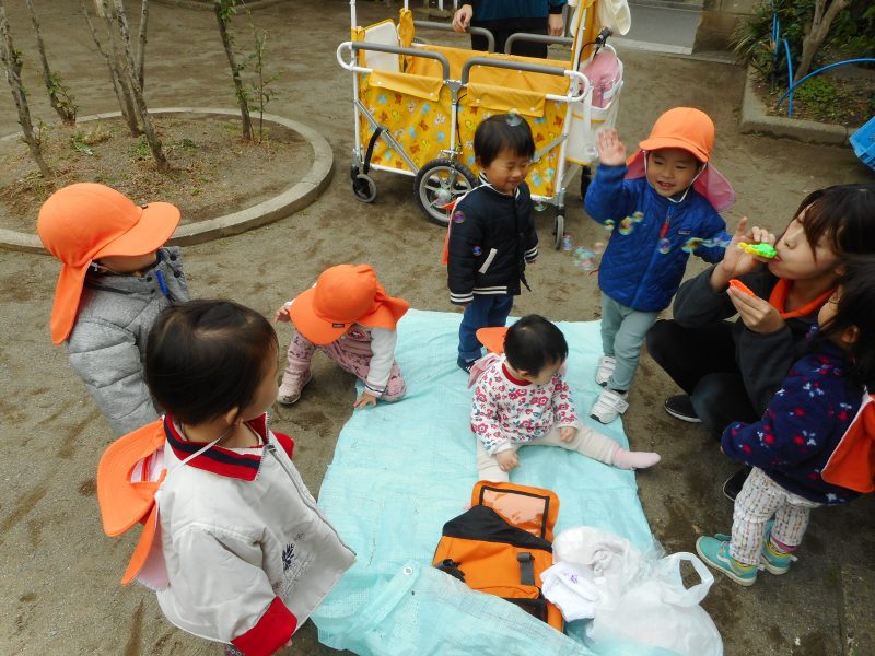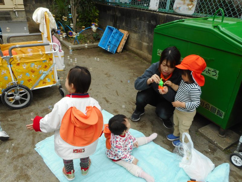 のお散歩は欠かせません。電車を見た後、えんぴつ公園やふれあい児童遊園で思い切り体を動かしたり、お砂遊びをしたり、それぞれが好き