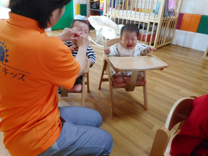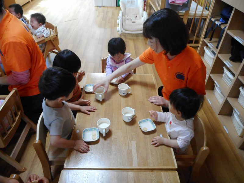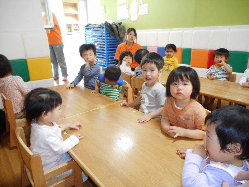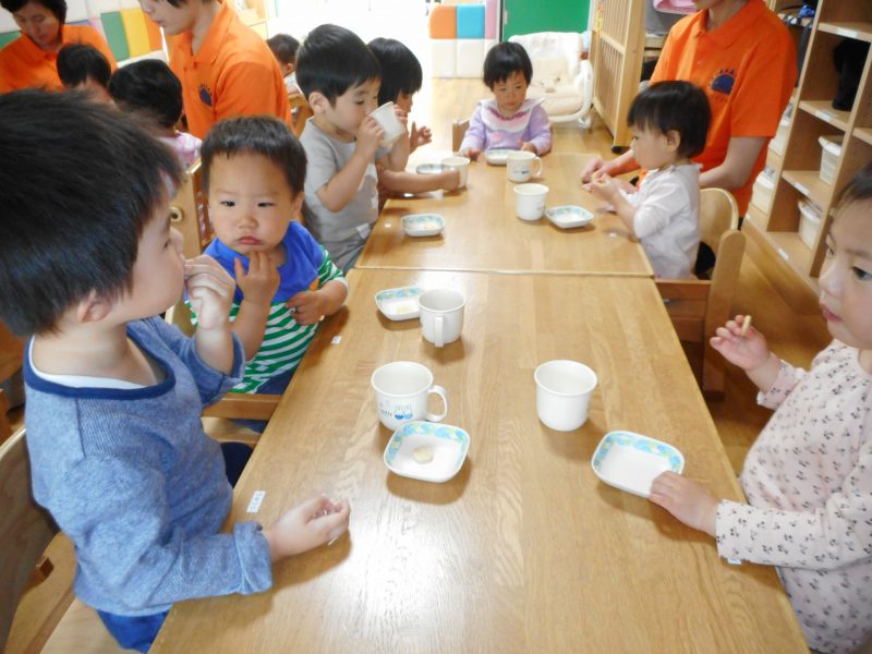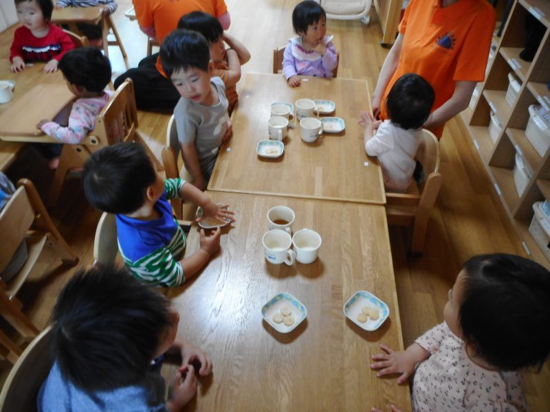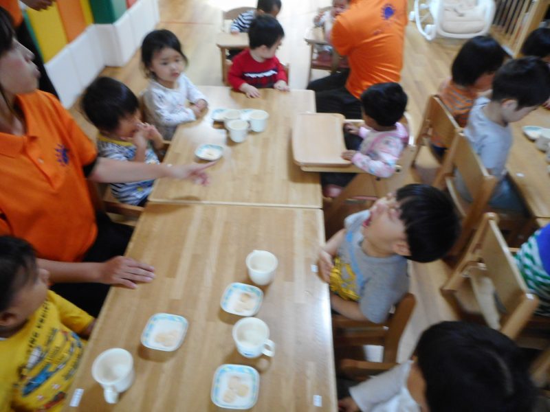 なってきました。全員に配り終わるまでに早く食べたくて涙がこぼれちゃう子、待ちきれなくておやつに手を伸ばしちゃう子、落着いて待っ