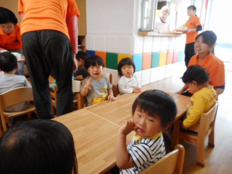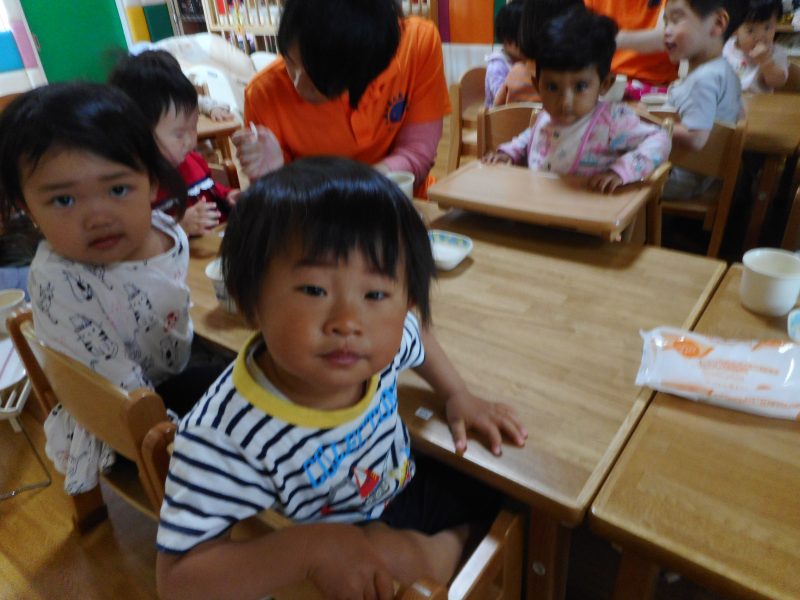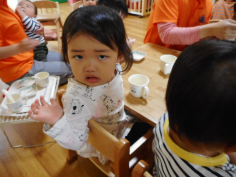 ていられる子、様々です。そして、準備が整うと保育士が「皆さんご一緒に」の呼びかけで(両手を合わせて)「いただきます。」をして食