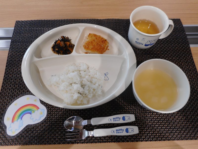 ご飯、味噌汁、魚のフライ、ひじきの炒り煮