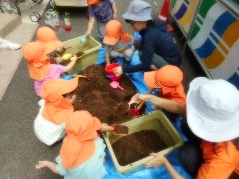 5月27日に土慣らしをし、28日に苗付けを行いました。両日とも晴天に恵まれました。子ども達は、シャベル片手にプランターの土をブルーシー