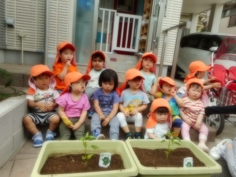 食育の一環として、今年は「ピーマン」を育てることにしました。初心者でも育てやすいそうです。また、ピーマンが苦手な子ども達も多いので、