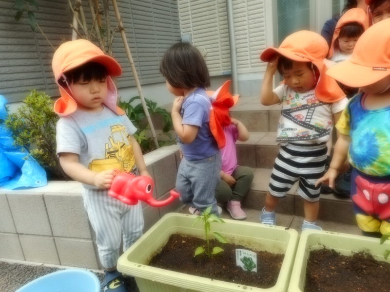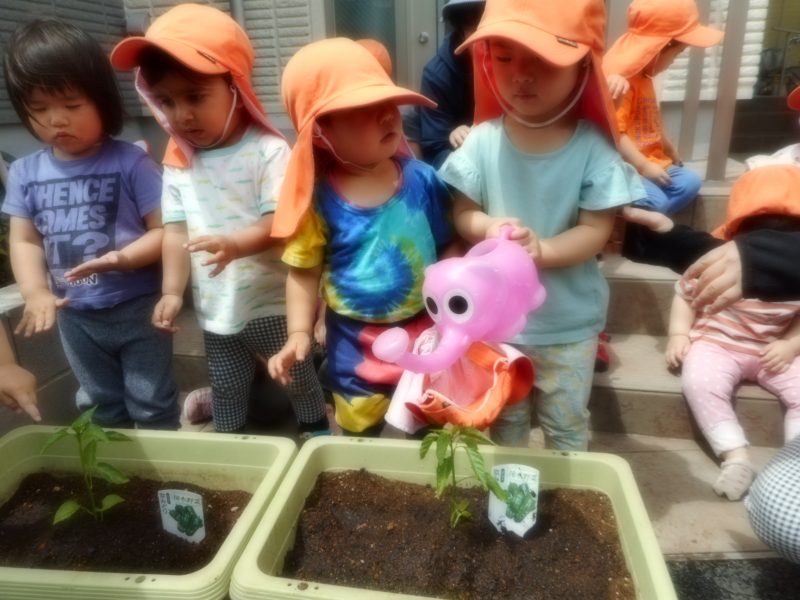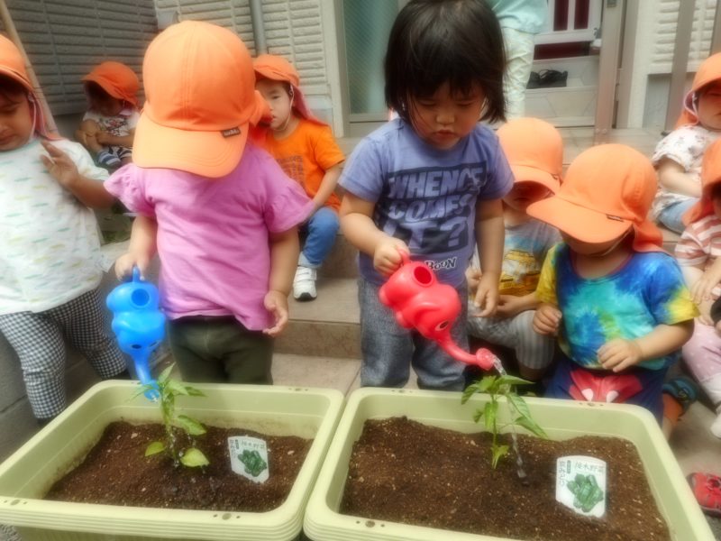 毎日、いちご組・りんご組さんに分かれて水やり当番を決めお世話していますよ。ご家庭でも、ピーマンについてや水やりについてなどお話をしてみ