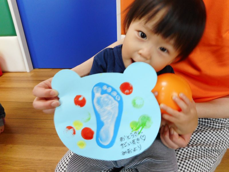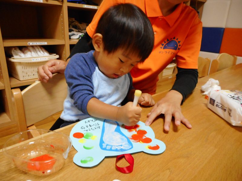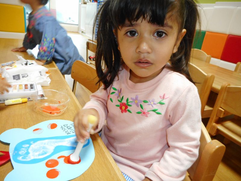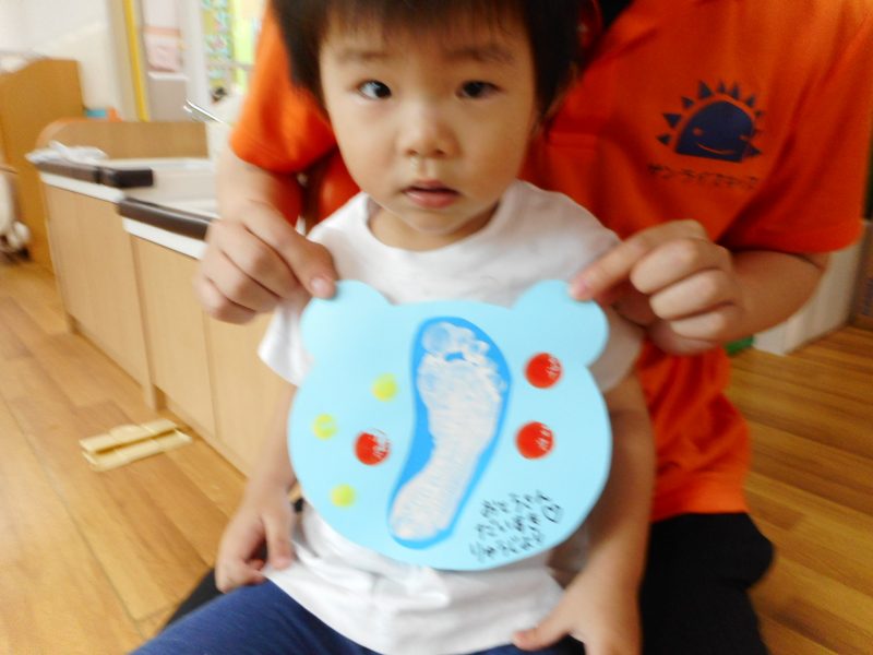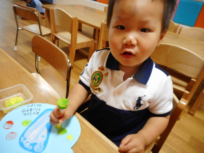 足の裏に絵の具を付ける感触を楽しむ子、気持ち悪がる子、くすぐったがる子、様々でしたがみんなきれいに足型をとることができました。