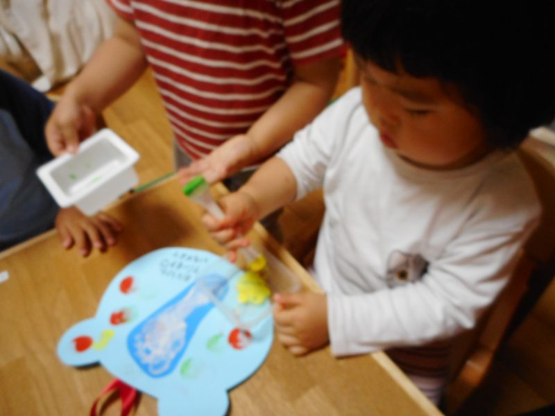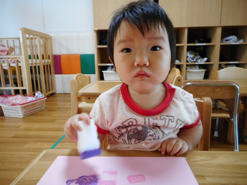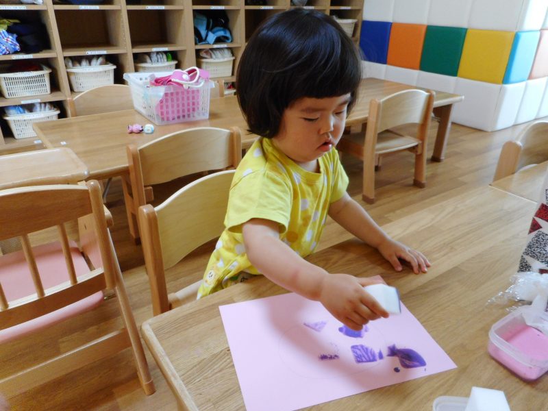 梅雨時期はお部屋で遊ぶことが多くなってきます。子ども達は、制作活動が好きでお絵かきや絵具遊びで自由に表現遊びに取り組んでいます。