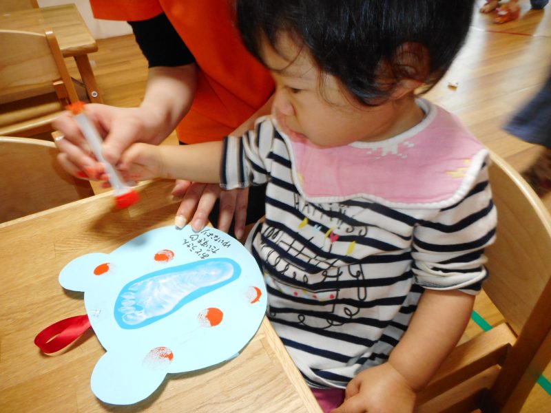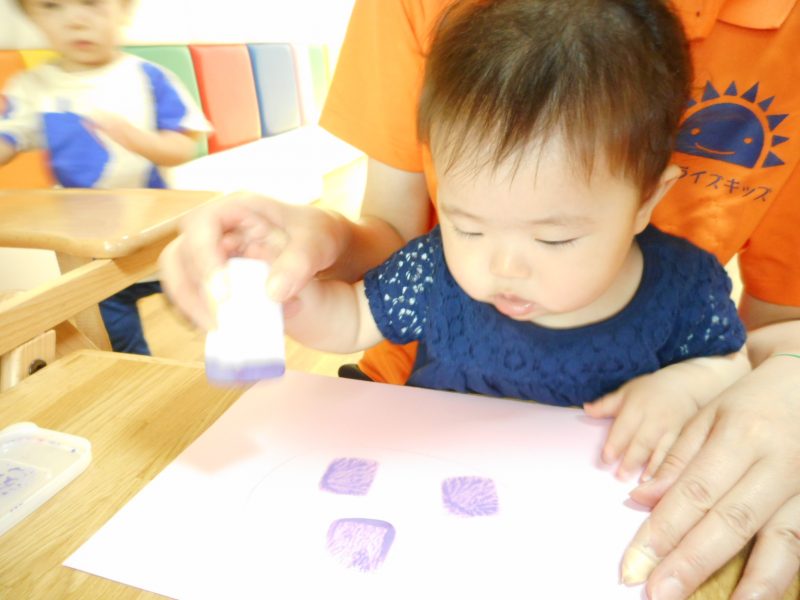 0・1歳児さんは、スポンジに絵の具を含ませポンポンとリズミカルにスタンピングしています。