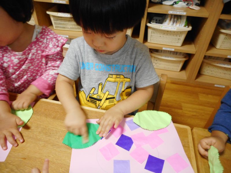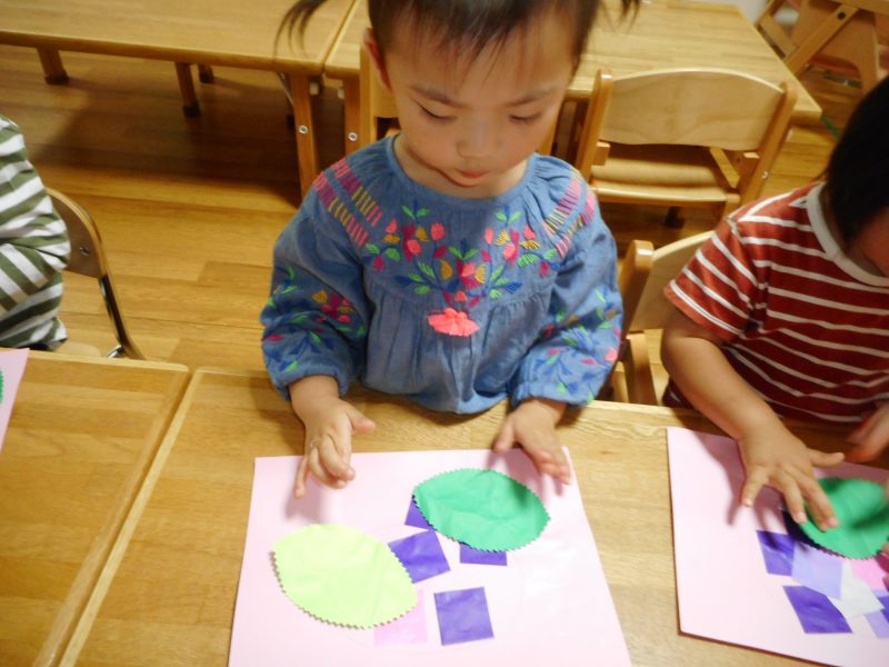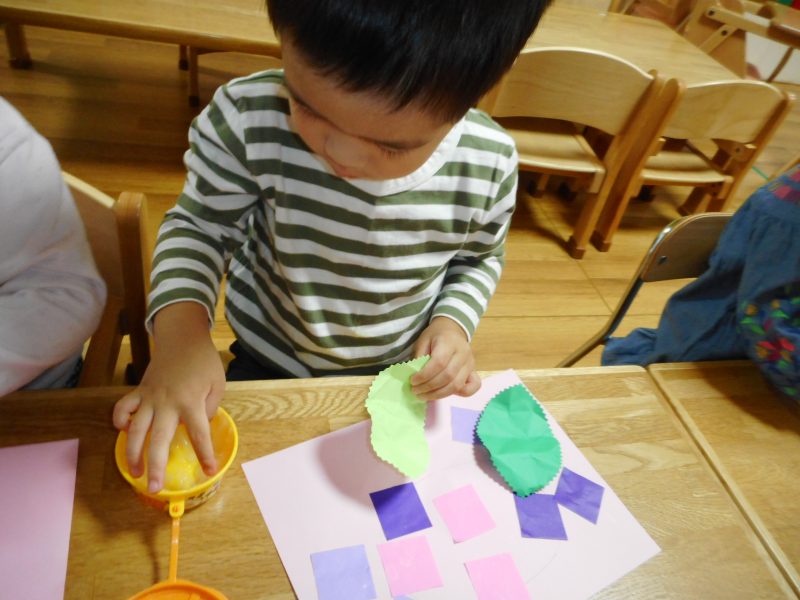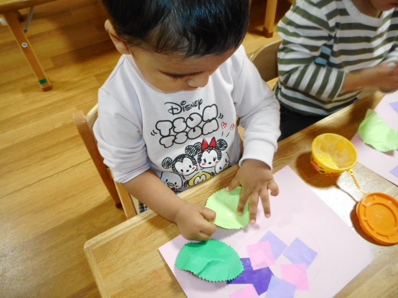 2歳児さんは、折り紙のお花を葉っぱと共にのりで貼っています。