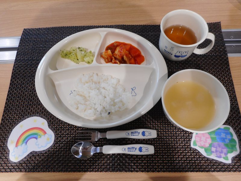 ご飯、味噌汁、チキンと野菜のケチャップ煮込み、粉ふき芋