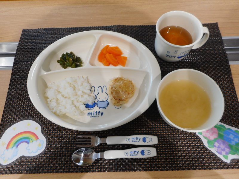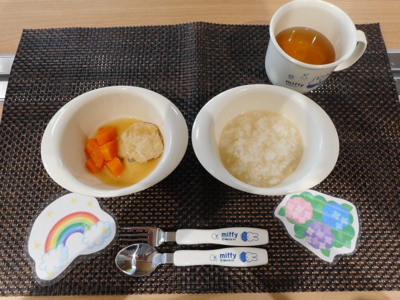 和風だしおかゆ、煮込みハンバーグ、ゆで人参