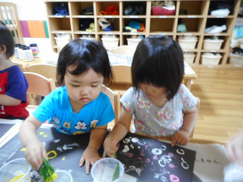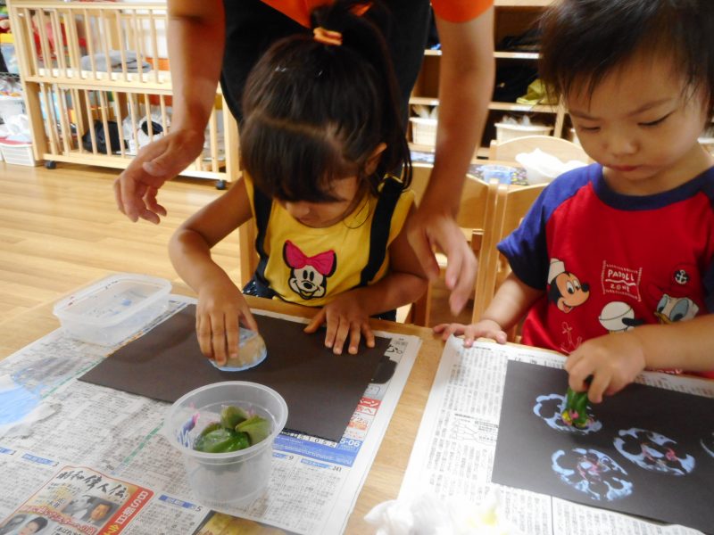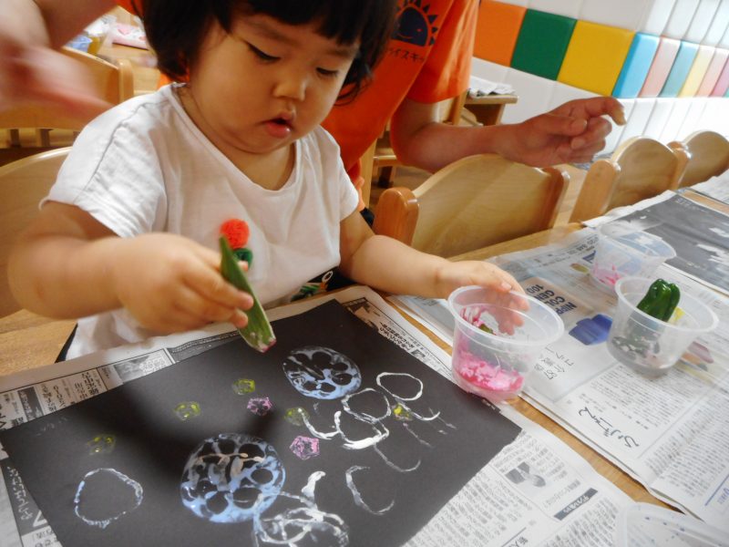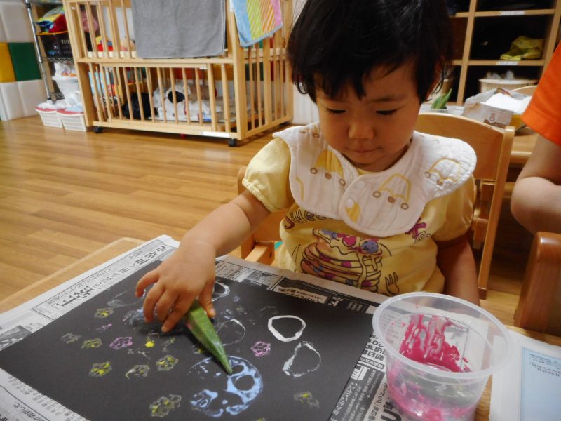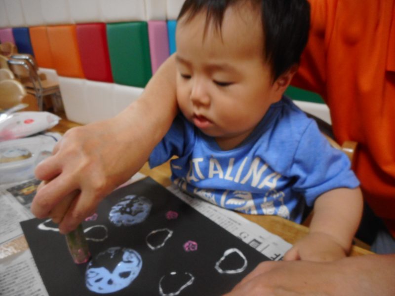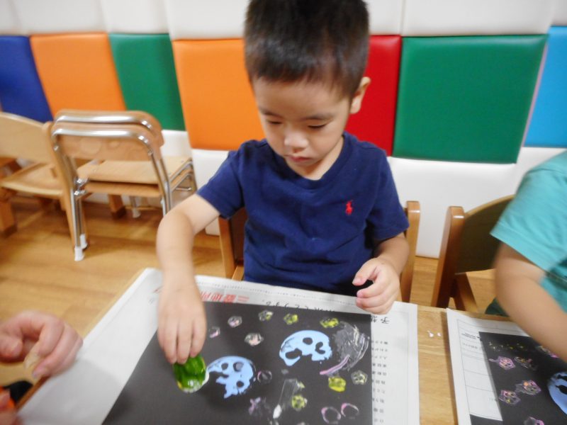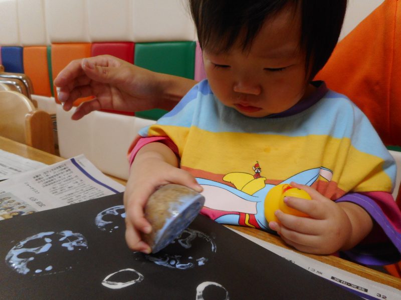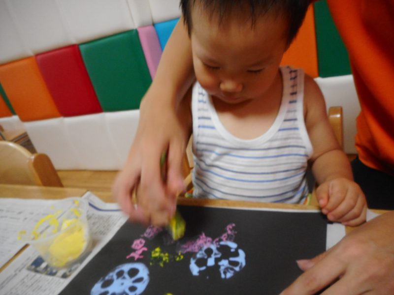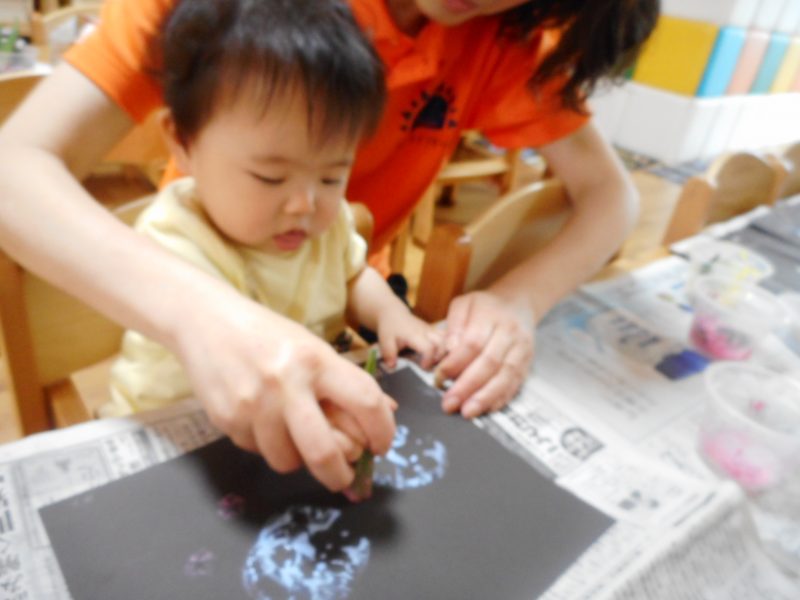 スタンプ!!好きなようにペッタン、ペッタン・・・。色や形の楽しさを感じてくれました。