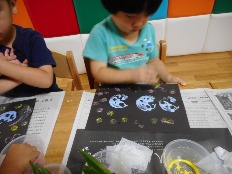 オクラとレンコンも加えて「野菜スタンプ」に挑戦です。