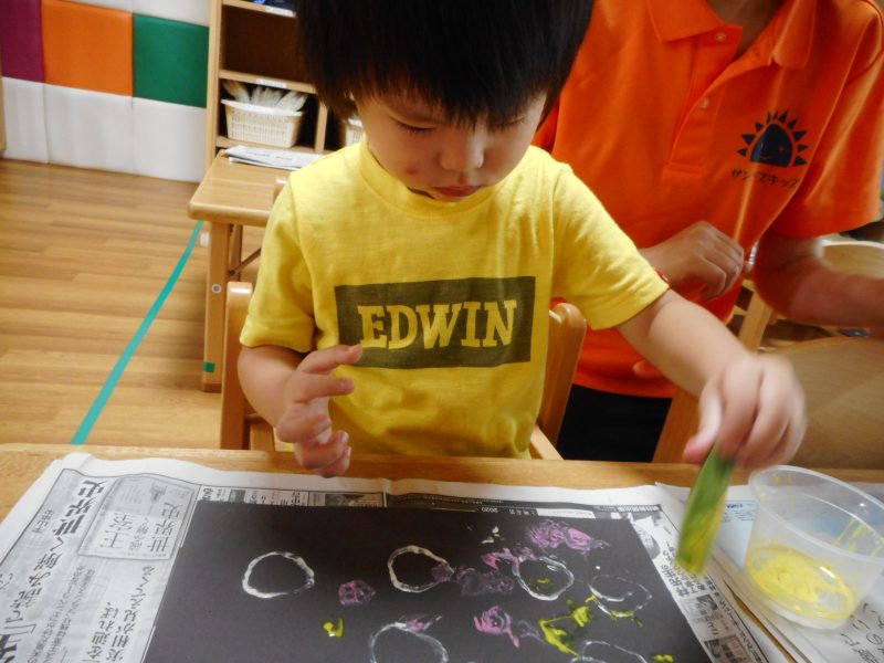 いよいよ野菜を切って断面を見ると、「星みたい」「あながあいてる」など好きな野菜を手に取り好きな絵の具を付けて