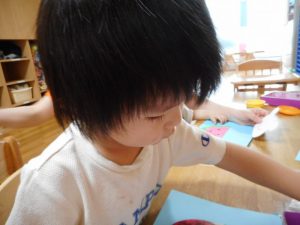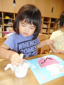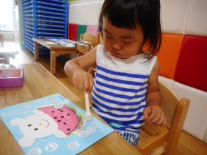 制作ではスイカに種をみ見立てたシール貼り制作を楽しんでいます。クマさんがスイカを食べているところですね。
