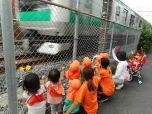久々にみんなで見る電車に、大喜びです。もも組さんもカートに乗ってお外の空気を吸いに気分転換