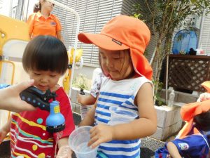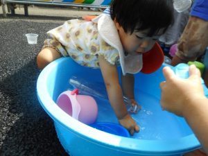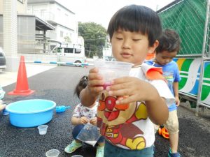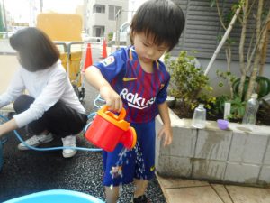 色水遊びの後は、いつものように水遊びで自由に楽しみました。