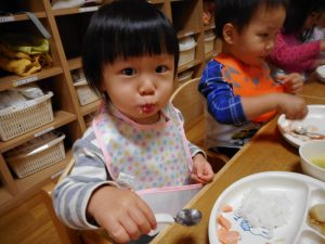 2歳児さんは、ごはんとおかずを交互に食べようと意識するようになりました。