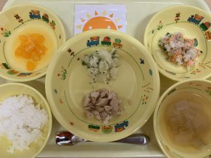 軟飯 味噌汁 刻み照り焼きチキン 大根サラダ 粉吹芋 みかん