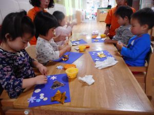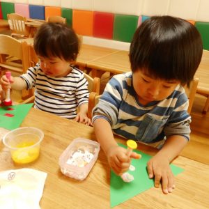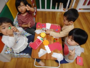 いろいろ制作していく中で、好きな色や形を発見したり、お友達と見せっこしながら会話と楽しんだりできました。