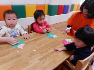 もも組さんは、シール貼りとのりを使って保育士と一緒に頑張りました。のりの感触を楽しん