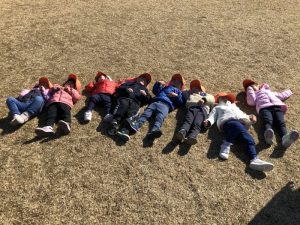 途中で休憩をしたときに、一人の子が芝生に大の字に寝ころびました すると、ほかの子も次々に寝そべってまぶしそうにお日さ
