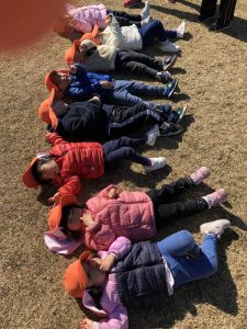途中で休憩をしたときに、一人の子が芝生に大の字に寝ころびました すると、ほかの子も次々に寝そべってまぶしそうにお日さ