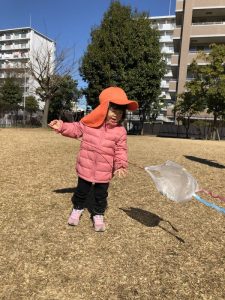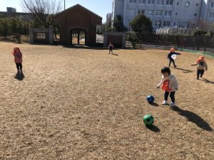 風が吹いていたので凧あげする子、バトンリレーで走り回る子、葉っぱの下を掘って秋のドングリを探す子、ボール遊びする子など、さまざ