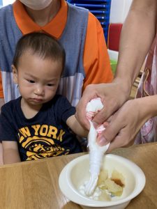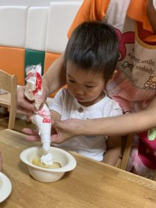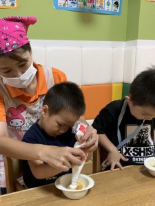 1人ずつ先生と一緒に生クリームをだして