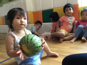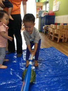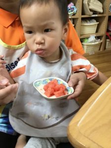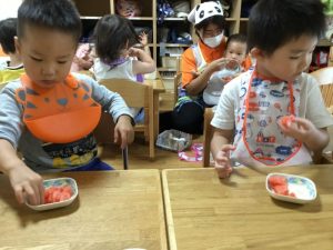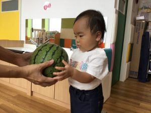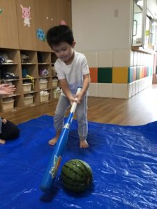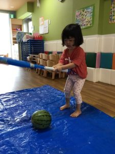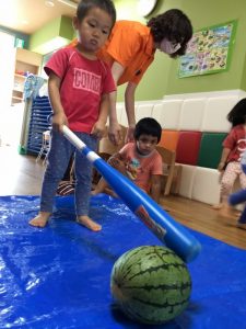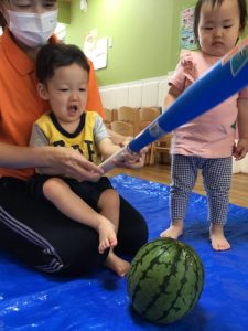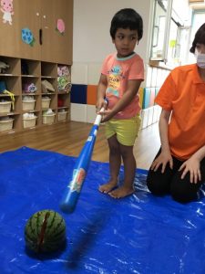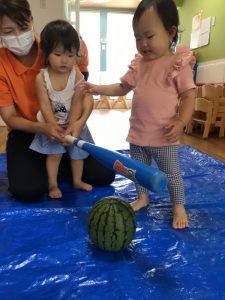 保育園ではスイカ割りをして夏を楽しみました![]()