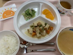 粥 豆腐の煮物 キャベツの煮浸し みかん缶