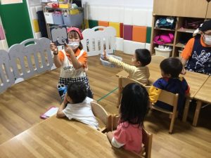 今日の朝の会と絵本読みの様子です。