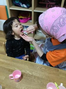 仕上げ磨きは大好きな担任の先生に