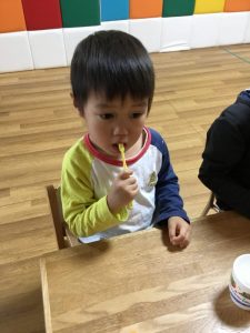 「はをみがきましょう」の音楽に合わせて自分で磨いてみます![]()