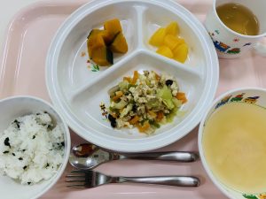 粥 味噌汁 豆腐チャンプルー かぼちゃの甘煮 オレンジ