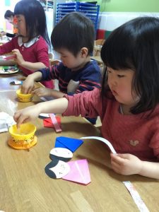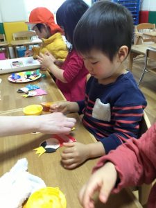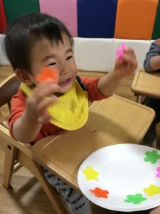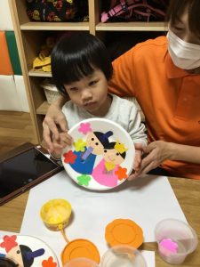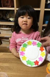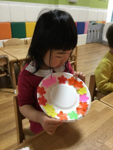 紙皿に好きなお花をつけて子ども達も