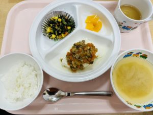 ご飯 味噌汁 煮豆腐の野菜みそかけ ひじきのサラダ オレンジ