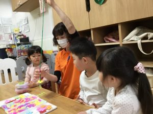 先生が可愛いお花とひもを持ってきて興味津々!