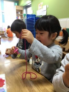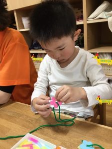 やってみるとみんな真剣な顔でひもに通していましたよ