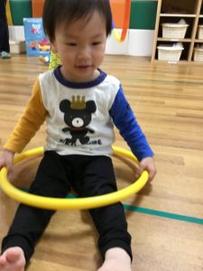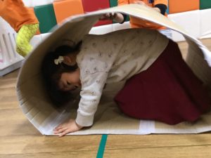 今週は段ボールでつくったキャタピラーやフラフープで