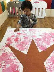 手に絵の具をつけるために筆で手をさわるとくすぐったいみたいで